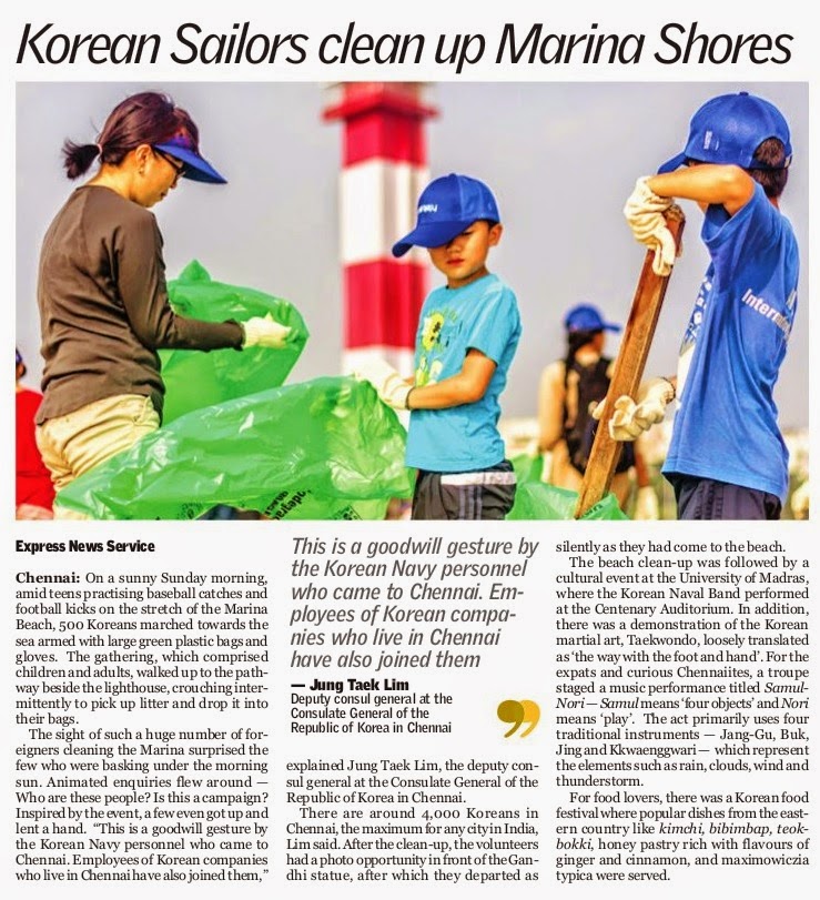 It was an event organized by Korean Navy and Indian Maritime University to Cleanup Marina beach on 16th November, 2014 (Sunday).